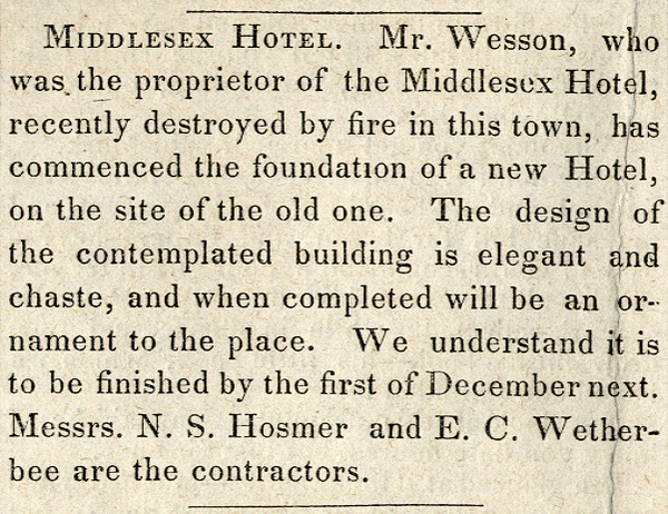 The original Middlesex Hotel caught fire on Tuesday, June 10, 1845, when Colonel John Wilson was the resident manager. Although the stable and surrounding buildings were spared, the hotel itself was destroyed. Against the advice of those who understood that times were changing, Wesson insisted on rebuilding a new hotel on the location of, and similar to, the one that had gone up in flames. The major changes were the moving of the main entrance from the southeast corner to the center of the south side (facing the Mill Dam), the relocation of the dance hall to the north end of the building and the fitting of it with a spring floor, and some alterations to the porch configuration. In constructing a porch on the east side, Wesson used remnants of the cornerstone of an unfinished monument to the Concord Fight placed on the common in 1825.