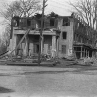 Image description: A black-and-white photograph of the Middlesex Hotel mid-demolition. The top two floors of the hotel have been demolished, and piles of wood lie around the building.