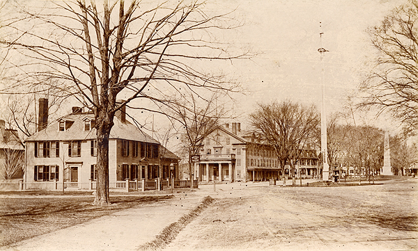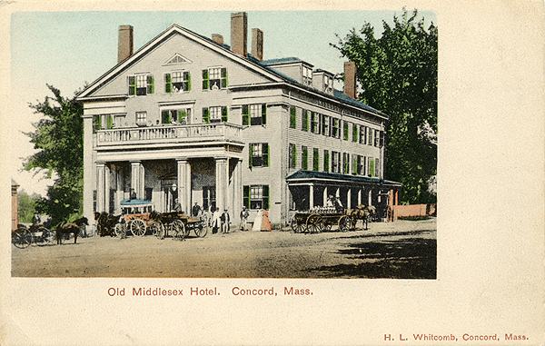 The Middlesex Hotel—once located at the corner of Main Street and Monument Square, opposite the Wright Tavern—thrived as a center of county and town life for decades during the nineteenth century. It provided food, drink, and lodging for lawyers, litigants, and witnesses on court days while Concord was still a shire town, and served up meals to the prisoners in the county jail behind what was then the County House (now the Catholic rectory).