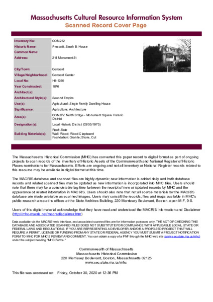 Browse Items (1949 total) Browse All Browse by Tag Search Items Browse Map Sort by: Title Creator Date Added / 195 pages 211 Hubbard Street Lowden, Andrew S. 1887 212 Williams Road Unknown r 1820 214 Monument Street Unknown 1876 215 Lexington Road Chapman, John H. r 1820 215-217 Virginia Road Unknown c 1878 216 Westford Road Unknown c. 1710 22 Derby Street Unknown c. 1890 22 Grant Street Unknown c. 1880 22 Monument Square Bond, Richard; Foster and Dutton; Thayer, George B. 1851 22-28 Walden Street Lovell 1904 Sort by: Title Creator Date Added / 195 pages Output Formats atom, dcmes-xml, json, omeka-xml, rss2