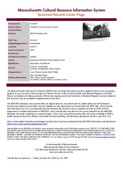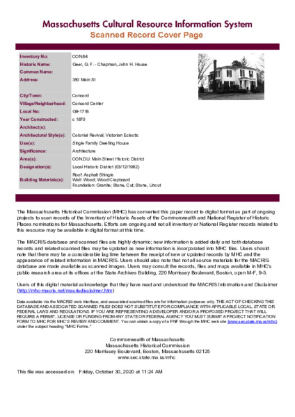 Browse Items (1949 total) Browse All Browse by Tag Search Items Browse Map Sort by: Title Creator Date Added / 195 pages 350 Fitchburg Turnpike Unknown r 1775 350 Main Street Unknown c. 1870 352 Sudbury Road Unknown c. 1840 36 Laws Brook Road Unknown c. 1910 36 Main Street Unknown 1828 363 Main Street Unknown 1875 368-374 Sudbury Road Unknown 1816 37 Lexington Road Unknown c. 1752 37 Main - 1-5 Walden Street Unknown c. 1845 37 Main - 13-15 Walden Street Little, Harry Britton r 1935 Sort by: Title Creator Date Added / 195 pages Output Formats atom, dcmes-xml, json, omeka-xml, rss2