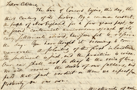 The manuscript of the discourse read by Ralph Waldo Emerson on September 12, 1835 came to the library in 1985 as the gift of David Emerson (great-grandson of Ralph Waldo) in commemoration of the 350th anniversary of Concord’s incorporation. Containing numerous emendations and deletions in the author’s hand, the manuscript was used not only for delivering the speech, but also (as the presence of footnotes suggests) as printer’s copy for the 1835 first publication of the discourse.
