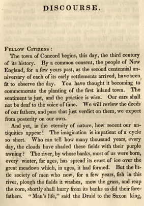 In his Ralph Waldo Emerson: A Descriptive Bibliography, Joel Myerson refers to a copy of the printed discourse inscribed by Charles Eliot Norton in 1860: “This discourse has become very rare, most of the copies having been destroyed, many years ago, in a fire at the office of the Town Clerk in Concord.”