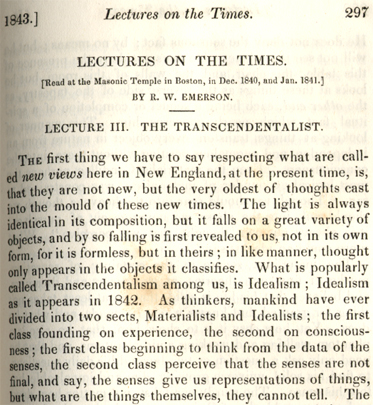 One of the pieces by Emerson published in The Dial was “The Transcendentalist” (Myerson E75). Originally delivered as part of a lecture series at the Masonic Temple in Boston in 1840 and 1841, the piece—shown here—was published in the January, 1843 issue of the periodical.