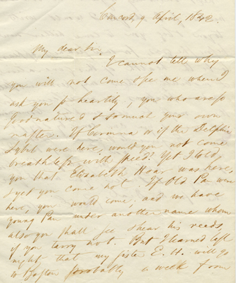 Emerson first met Charles King Newcomb in Providence in 1840. After he began to edit The Dial, he corresponded with Newcomb, urging him to submit pieces for publication and to visit Concord. In his letters to the young man, he presented an enticing picture of Concord as a place of charming natural appeal, enlivened by the comings and goings of a variety of interesting people. He wrote of Margaret Fuller, Henry Thoreau, Elizabeth Hoar, Bronson Alcott, Caroline Sturgis, Elizabeth Peabody, George Bradford, Nathaniel Hawthorne, Edmund Hosmer, and Ellery Channing.