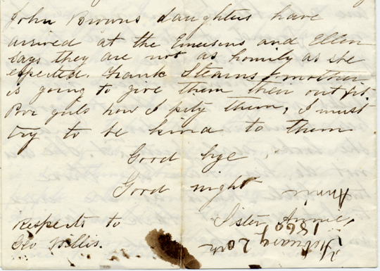 In February of 1860, Frank Sanborn arranged to bring Anne and Sarah Brown, two of John Brown’s children, to Concord to attend his school. When they arrived here, the Brown girls stayed with the Emersons. In the February 20, 1860 letter shown here, Annie Keyes Bartlett writes her brother Edward Jarvis Bartlett (“Ned”) of their arrival at the Emerson house. Annie and Ned were two of the nine children of Dr. Josiah Bartlett, who practiced medicine in Concord for fifty-seven years.