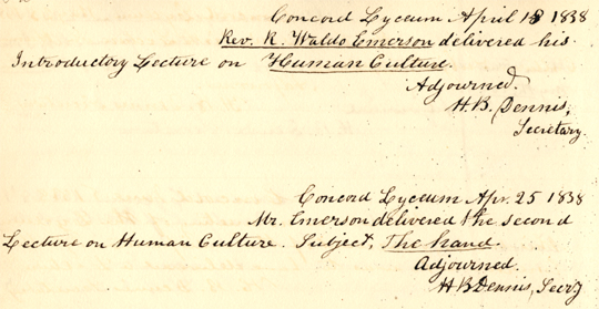 Emerson attended and delivered Lyceum lectures in Concord, served as an officer (“curator”) of the organization, and persuaded friends and acquaintances to come here to speak. His son Edward wrote that in addressing audiences of local people, he “never wrote down to them, but felt them entitled to his best thoughts.”