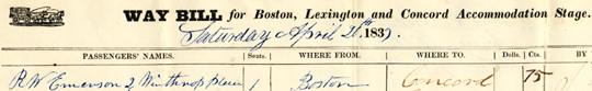 The waybill shown here reveals that Emerson shared a coach from Boston to Concord with eight fellow travelers—seven gentlemen and a lady—on April 20, 1839.