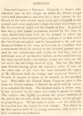 Emerson had served on the Committee on General Invitations for the 1875 celebration. He had also supported young Concord sculptor Daniel Chester French in obtaining the commission to design a statue to honor the colonial soldiers who fought on April 19, 1775. French’s bronze Minute Man was the first of many pieces of public sculpture that he created throughout his long, successful career. The first verse of Emerson’s “Concord Hymn” was inscribed on its base.