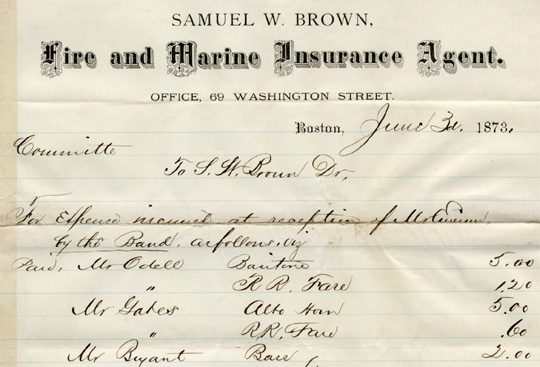 Emerson and Ellen sailed home on the Olympus, arriving in Boston late in May. Concord had planned a surprise welcome for them. On Tuesday, May 27th, detained by ruse on the ship until the town was ready to receive them, they took the 2:30 Fitchburg train. Emerson was deeply moved and more than a little confused when he stepped off the train at the Concord Depot and encountered a cheering crowd and ringing bells. A band had been hired, and a welcoming arch built by the gate of Bush. A procession of citizens and schoolchildren escorted four carriages—the final one bearing Emerson, Ellen, and the Forbeses—to the house, where Lidian waited. On their arrival, the accompanying children sang “Home Sweet Home.”