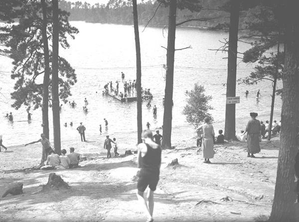 A photograph by Herbert Wendell Gleason taken from the shore overlooking the swimming beach at Walden Pond