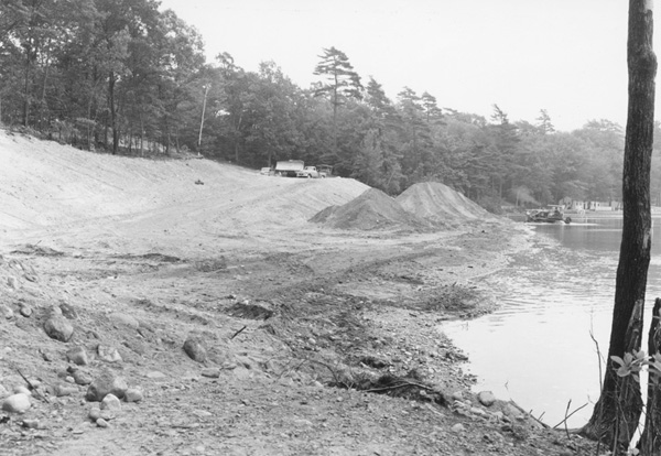 A photograph showing sand piles and trucks destroying the shoreline of Walden Pond