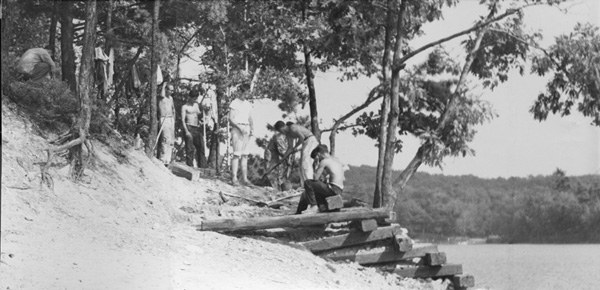 A photograph of the cribwork being created to prevent erosion at Walden Pond