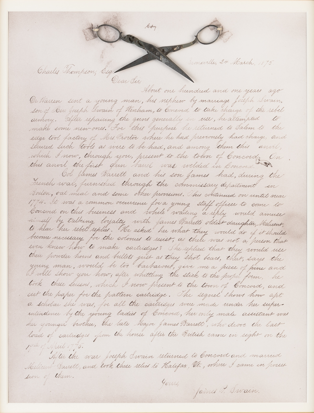 20201130-JEC_5556-RetouchedEdit.jpg ← Previous Item Next Item → Minuteman Scissors and Letter Title Minuteman Scissors and Letter Subject American Revolution and Concord Fight Description Object and Letter Rights Images © 2020 James E. Coutré Creator Created piece Publisher Concord Free Public Library Date 1999 Type Item and Document Identifier 2020-001-037 Coverage 23 1/2" x 20" - framed Collection Art Collection Tags Art Collection, Concord Fight, Minuteman, Revolutionary War, Scissors Citation Created piece, “Minuteman Scissors and Letter,” William Munroe Special Collections at the Concord Free Public Library, accessed December 16, 2025, https://www.sc.concordlibrary.org/items/show/2165. Output Formats atom dcmes-xml json omeka-xml