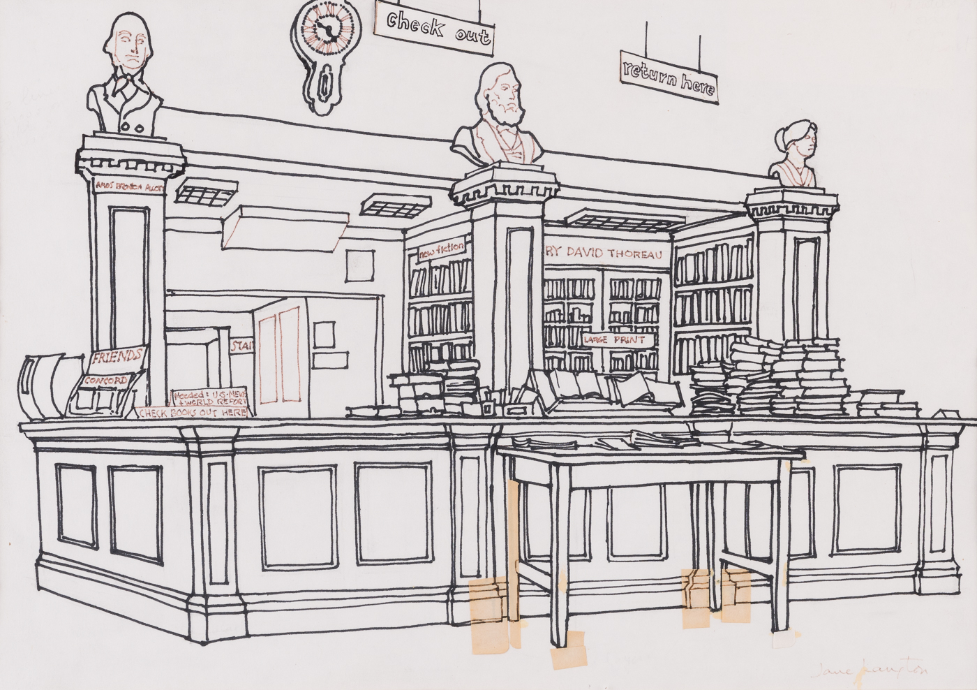 Jane Langton (?), “Concord Free Public Library Circulation Desk,” William Munroe Special Collections at the Concord Free Public Library, accessed December 16, 2025, https://www.sc.concordlibrary.org/items/show/2167.