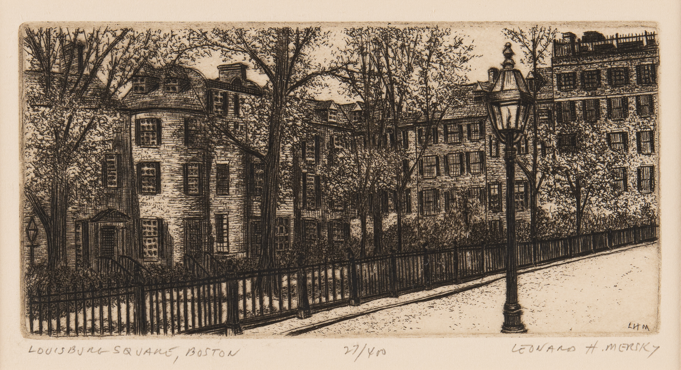 20201204-JEC_6514-Edit.jpg ← Previous Item Next Item → Louisburg Square, Boston Title Louisburg Square, Boston Subject Lithograph print of Louisburg Square in Boston Description Lithograph Rights Images © 2020 James E. Coutré Creator Leonard H. Mersky Source Unknown Publisher Concord Free Public Library Date Undated Type Lithograph Identifier 2020-001-081 Coverage 9 5/8" x 6 5/8" Collection Art Collection Citation Leonard H. Mersky, “Louisburg Square, Boston,” William Munroe Special Collections at the Concord Free Public Library, accessed December 16, 2025, https://www.sc.concordlibrary.org/items/show/2209. Output Formats atom dcmes-xml json omeka-xml
