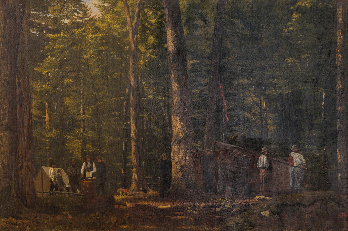 This painting—one of the best-known in the Concord Free Public Library art collection—includes the figures of both Ralph Waldo Emerson (in the center, standing alone between two trees) and Ebenezer Rockwood Hoar (the first figure to the right of Emerson’s). It depicts a visit by the “Adirondack Club”—an offshoot of the Saturday Club—to the Adirondack wilderness in 1858. The trip was organized by William James Stillman (1828-1901), a friend of Saturday Club members and the painter of this piece.