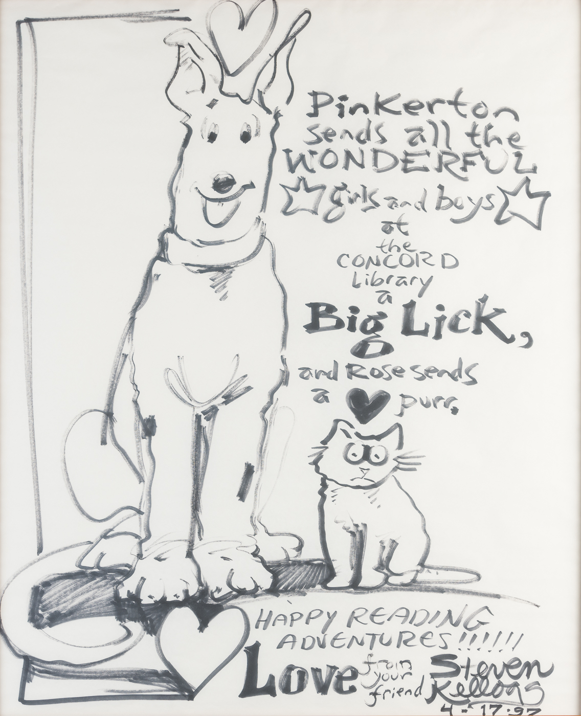 20201125-JEC_5268.jpg ← Previous Item Next Item → Pinkerton and Rose Title Pinkerton and Rose Subject Children's Art Description Marker on Paper Rights Images © 2020 James E. Coutré Creator Steven Kellogg Source Steven Kellogg Publisher Concord Free Public Library Date 04/17/1997 Identifier 2020-001-185 Collection Art Collection Tags Art Collection, Children's Art, Kellogg Citation Steven Kellogg, “Pinkerton and Rose,” William Munroe Special Collections at the Concord Free Public Library, accessed December 16, 2025, https://www.sc.concordlibrary.org/items/show/2313. Output Formats atom dcmes-xml json omeka-xml