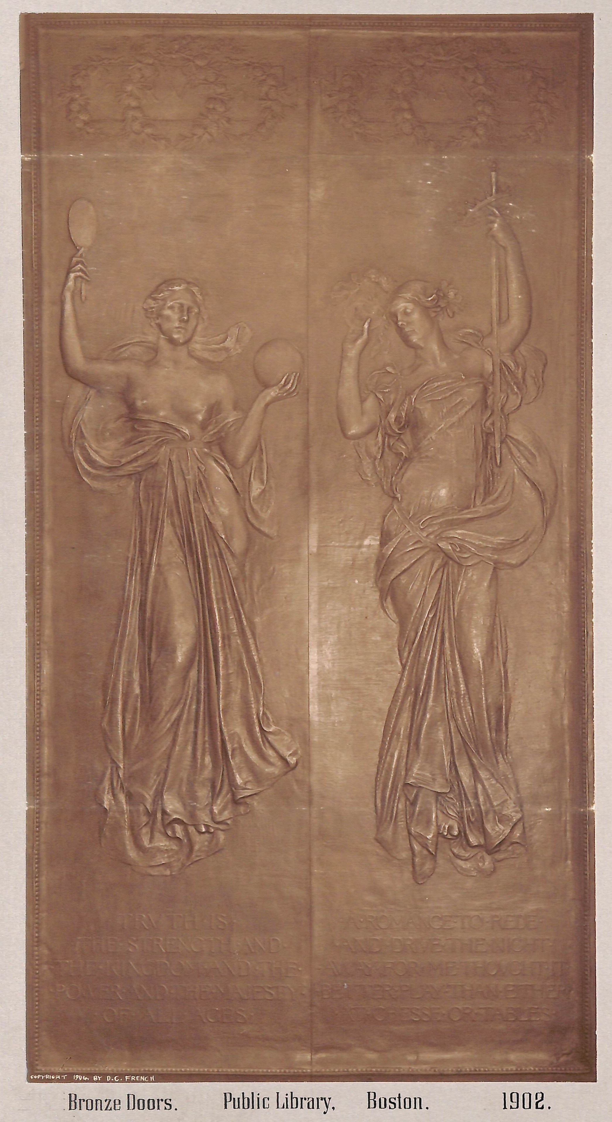 Photograph of the right hand bronze doors representing Truth and Romance at the Boston Public Library by Daniel Chester French