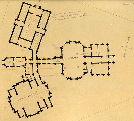 In 1875, William Munroe had plans drawn up by the architectural firm of Snell and Gregerson, who had designed the original building only a few years earlier. The plan had extensions for the library with an art museum on one side and a lending library on the other.