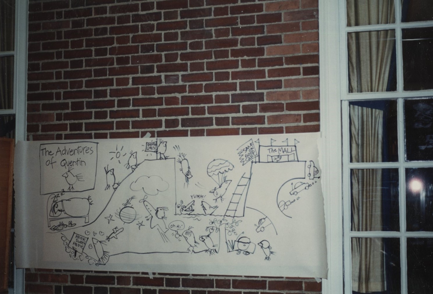 Image description: A color photograph of Alice Briggs's cartoon, "The Adventures of Quentin," which she drew on a large piece of paper taped to the wall during her event at the library.