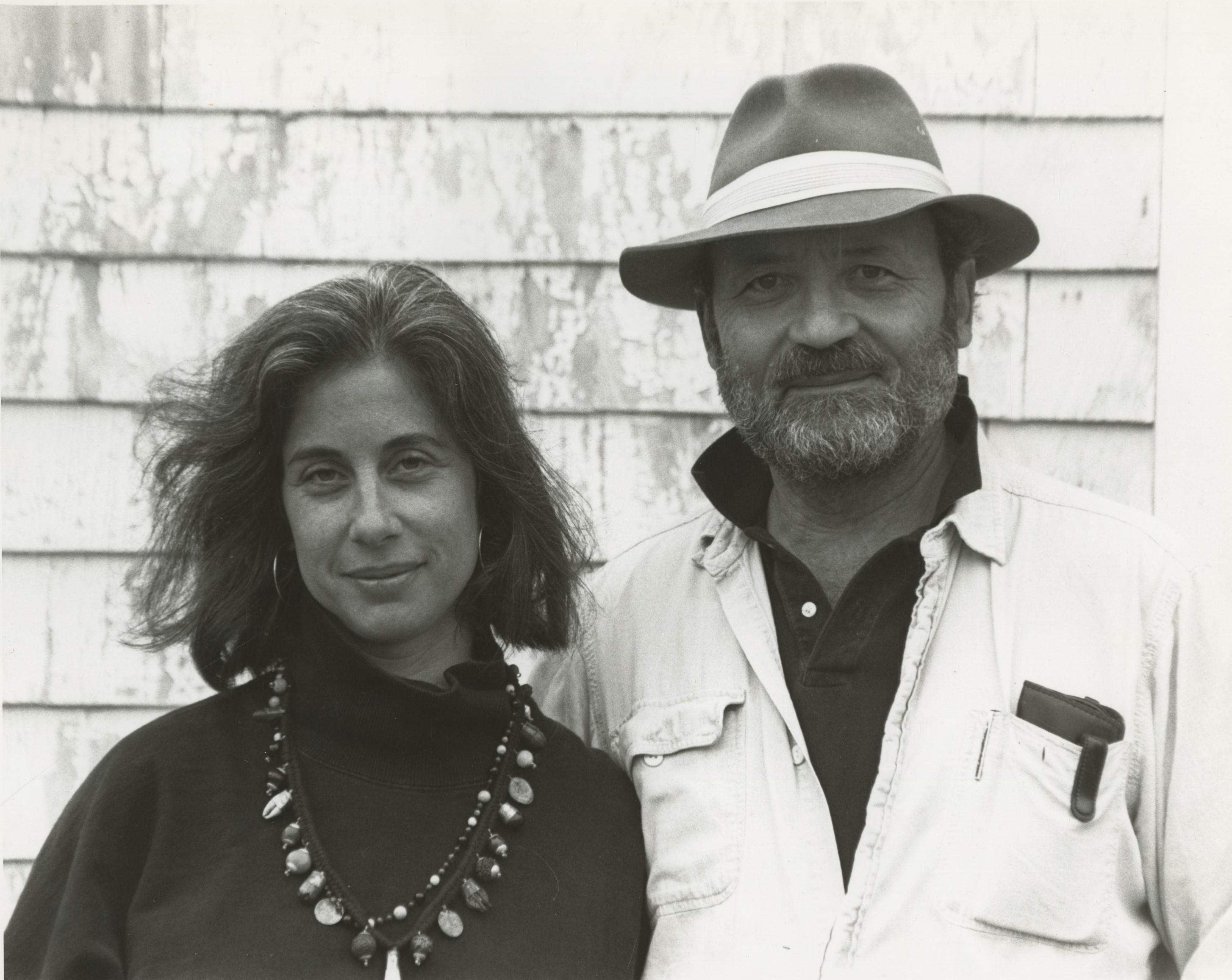 Image description: A black-and-white photograph of Susan Seligson and Howie Schneider. Susan Seligson is a white woman with shoulder-length dark hair. She wears a dark turtleneck and a necklace with large beads. Howie Schneider is a white man with a grey beard. He wears a white jacket and a fedora hat.