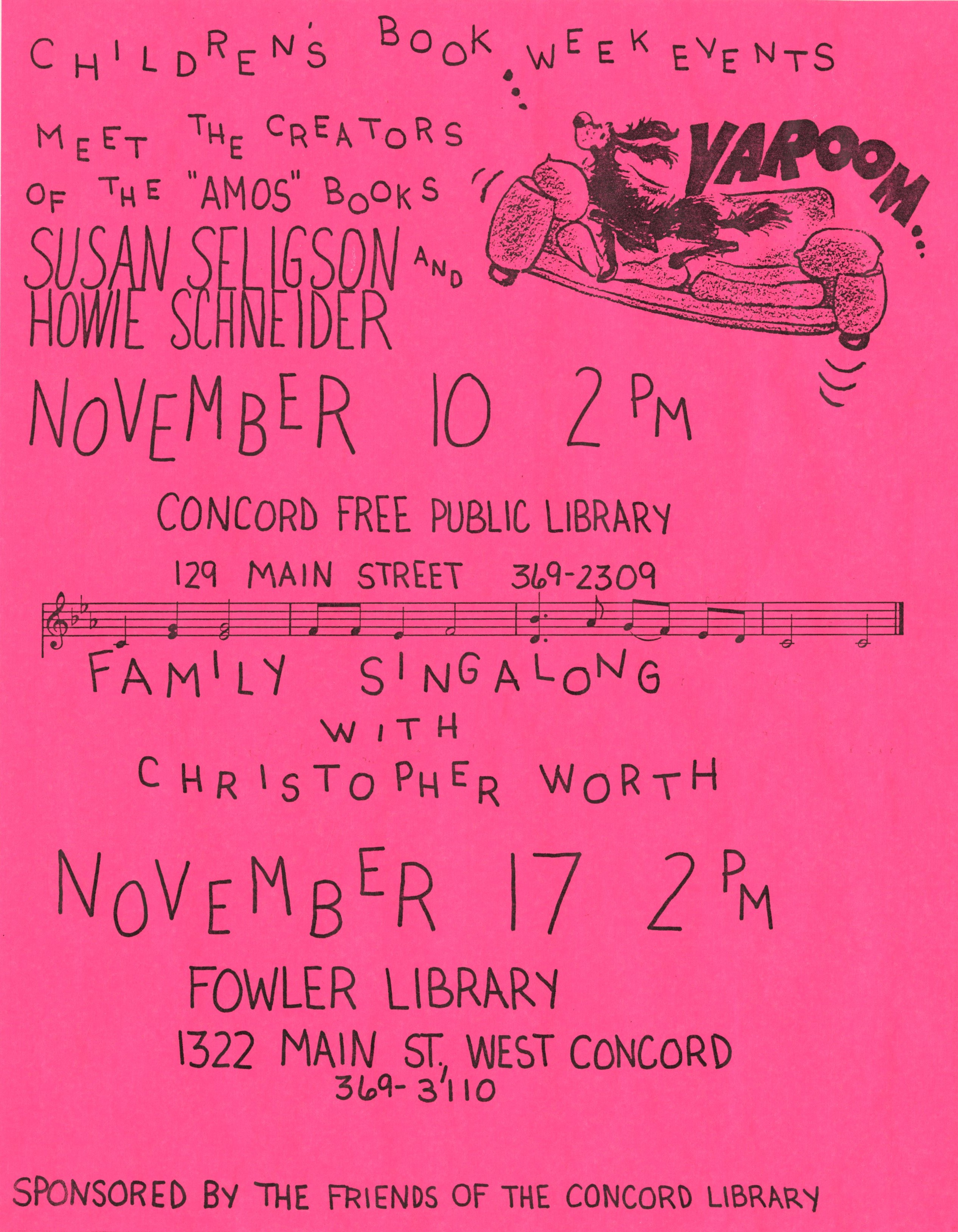 Image description: A color scan of a flyer for the visit of Susan Seligson and Howie Schneider, creators of the Amos books. The flyer includes black text on pink paper and a print of Amos, a large dog that says, "varoom!"