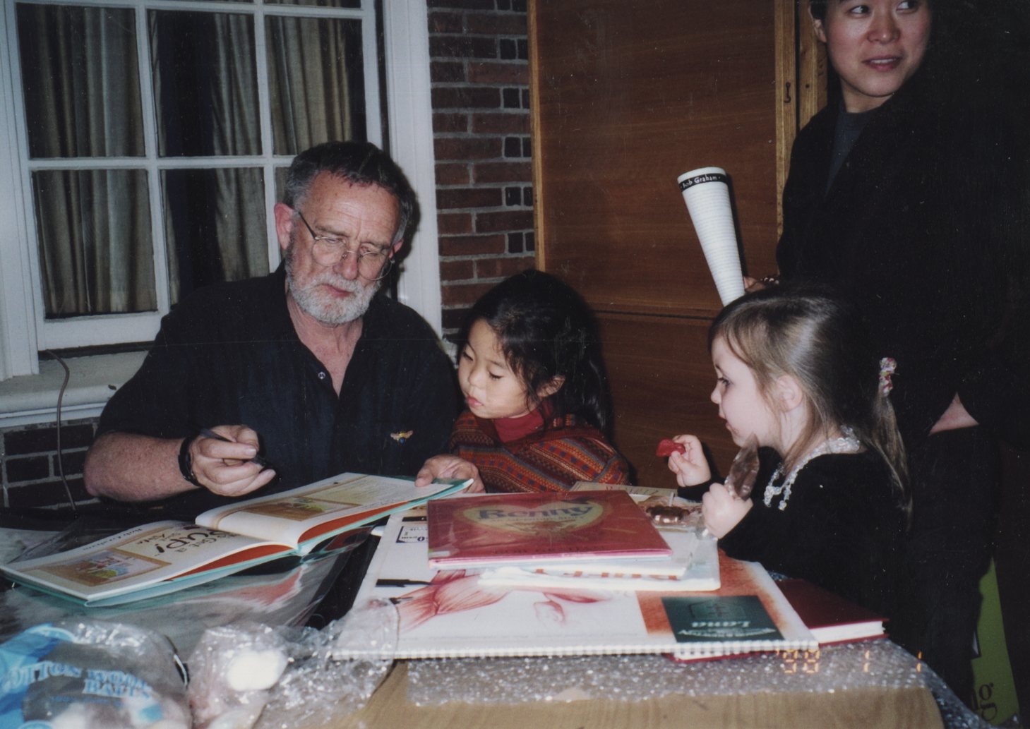 Image description: A color photograph of author Bob Graham, an older white man with grey hair, glasses, and a beard. He signs a book for two young girls who stand next to him.
