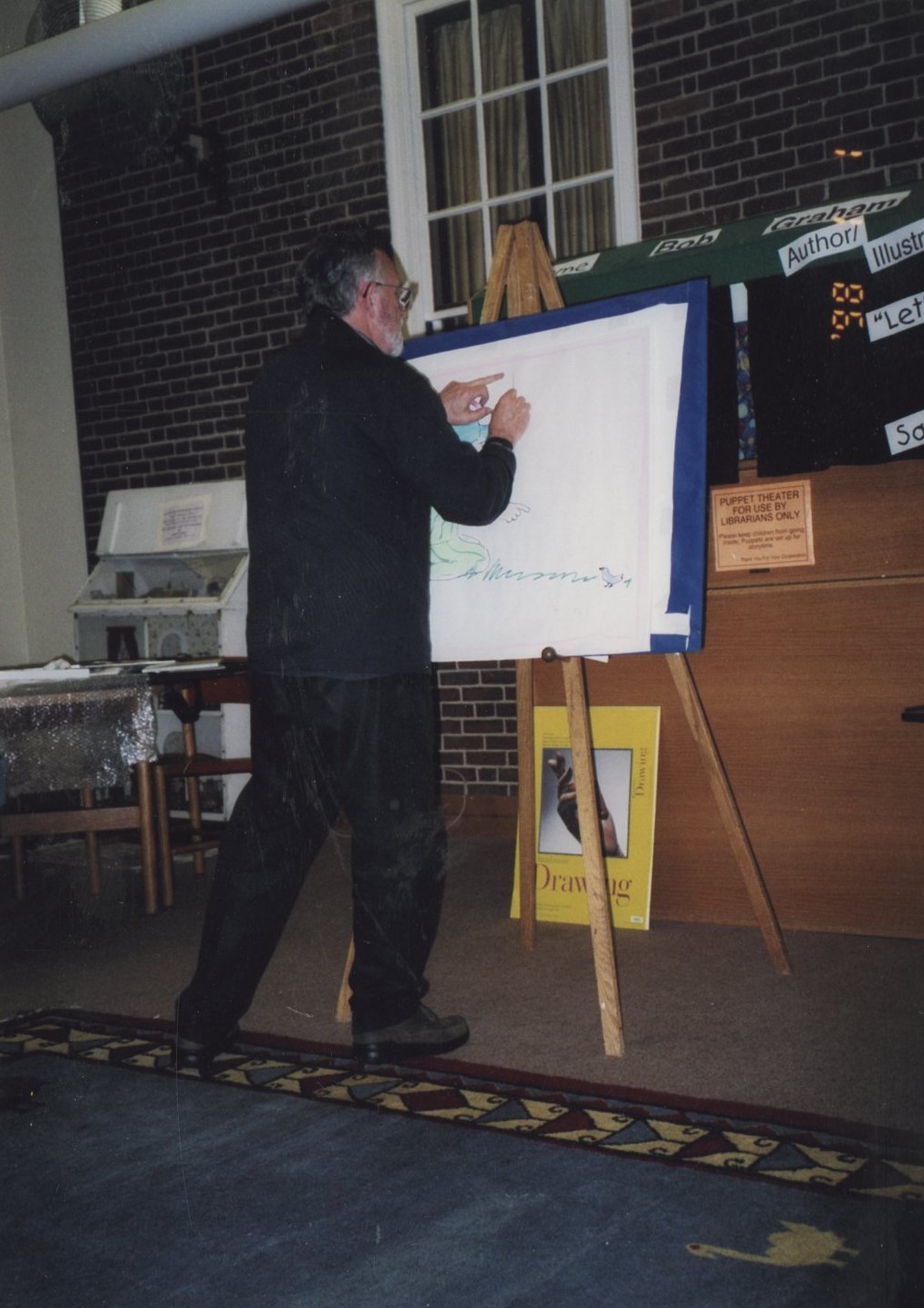 Image description: A color photograph of author Bob Graham, an older white man with grey hair, glasses, and a beard. He stands at an easel and draws.