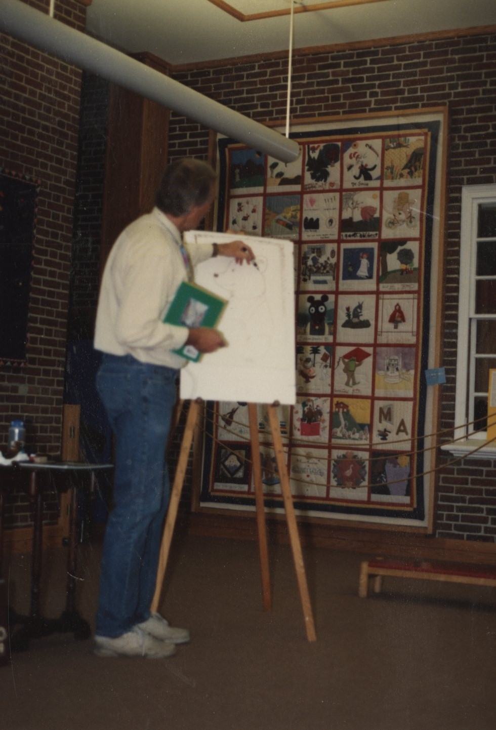 Image description: A color photograph of illustrator David McPhail, a white man with dark hair wearing a white shirt and jeans. He draws a picture of a bear on an easel.