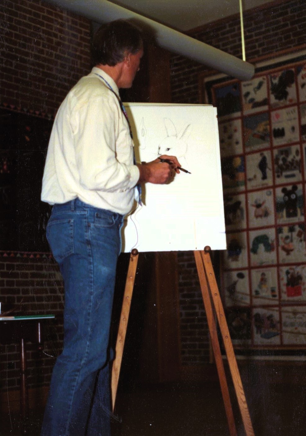 Image description: A color photograph of illustrator David McPhail, a white man with dark hair wearing a white shirt and jeans. He stands in front of an easel with a drawing of a rabbit on it.