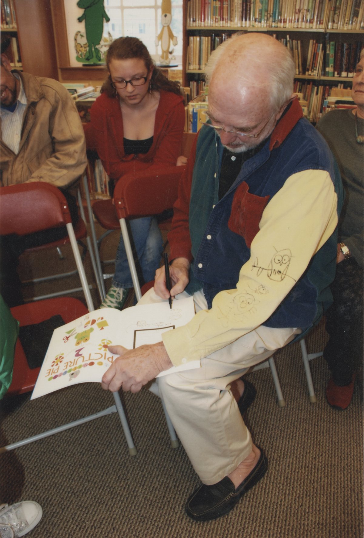 Image description: A color photograph of author Ed Emberley, an older white man with white hair and glasses wearing a colorful shirt. He signs a copy of his book, Picture Pie 2.
