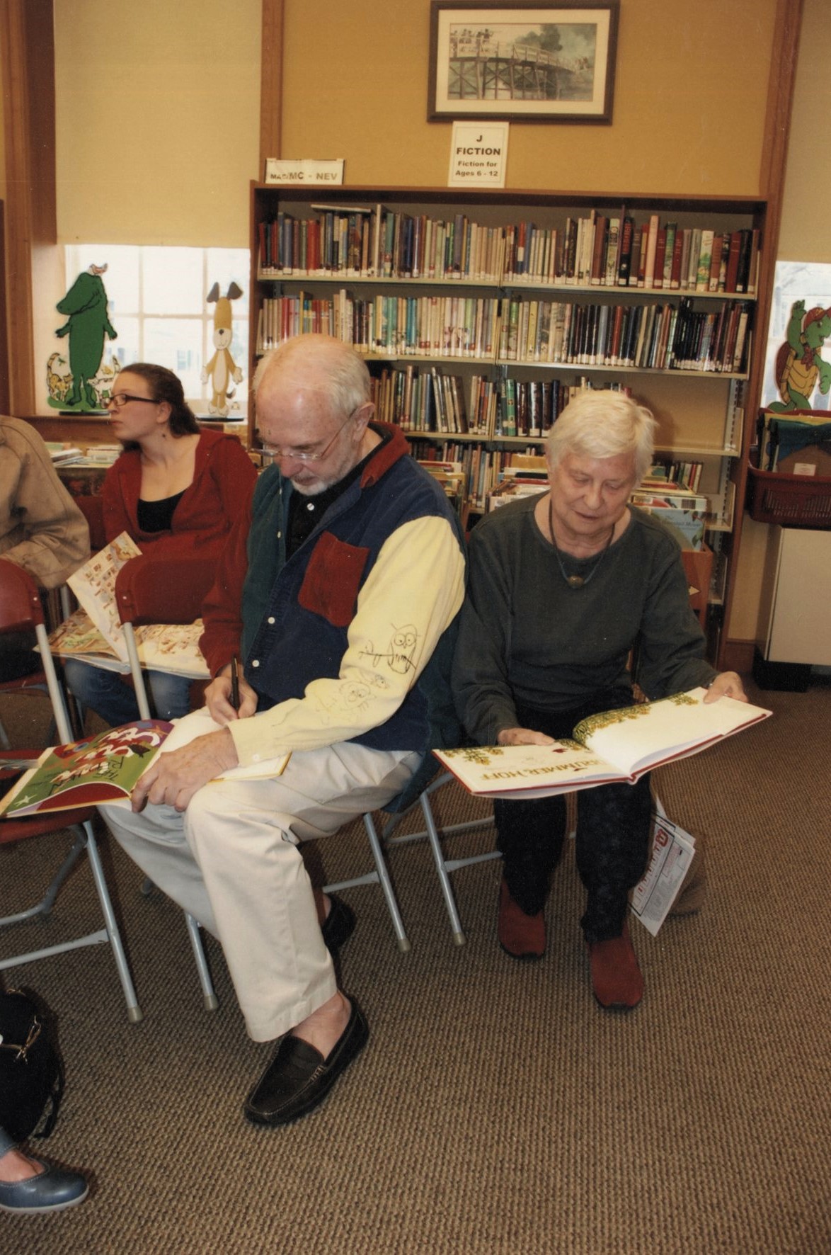 Image description: A color photograph of author Ed Emberley, an older white man with white hair and glasses wearing a colorful shirt. Emberley sits in a chair and signs a book while other adults are seated near him. Doodles are visible on the sleeve of his shirt.