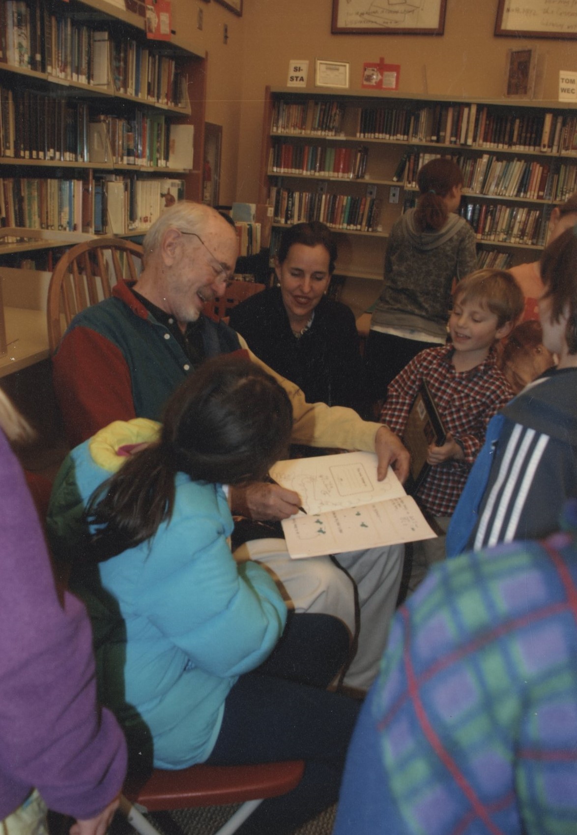 Image description: A color photograph of author Ed Emberley, an older white man with white hair and glasses wearing a colorful shirt. He sits in a chair and signs a book while a group of children stand around him.