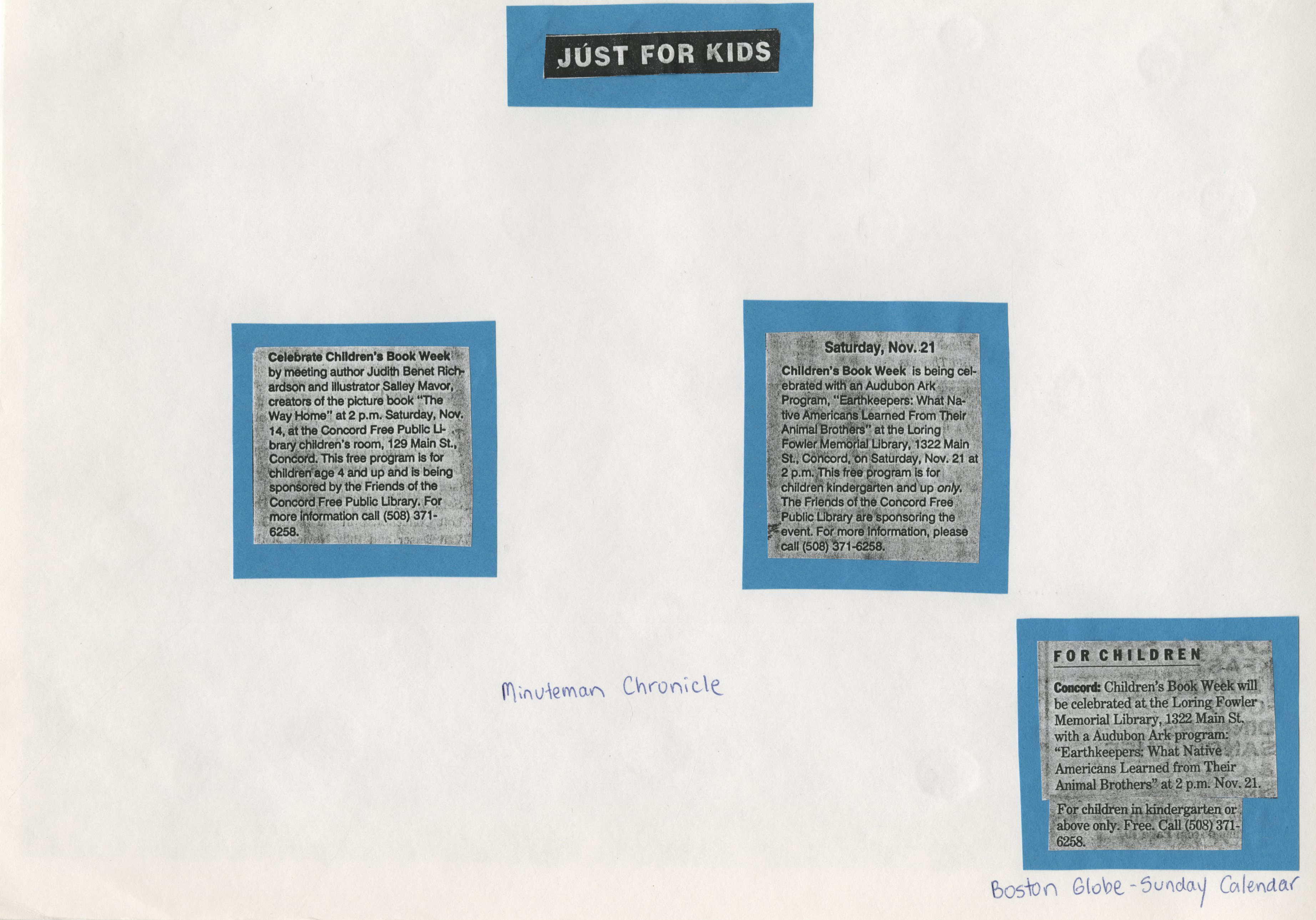 Image description: A collage of news clippings on white paper. Each clipping is pasted on a small square of blue paper. The first two clippings are from the Minuteman Chronicle, the third is from the Boston Globe. At the top is a clipped heading reading "Just for kids."