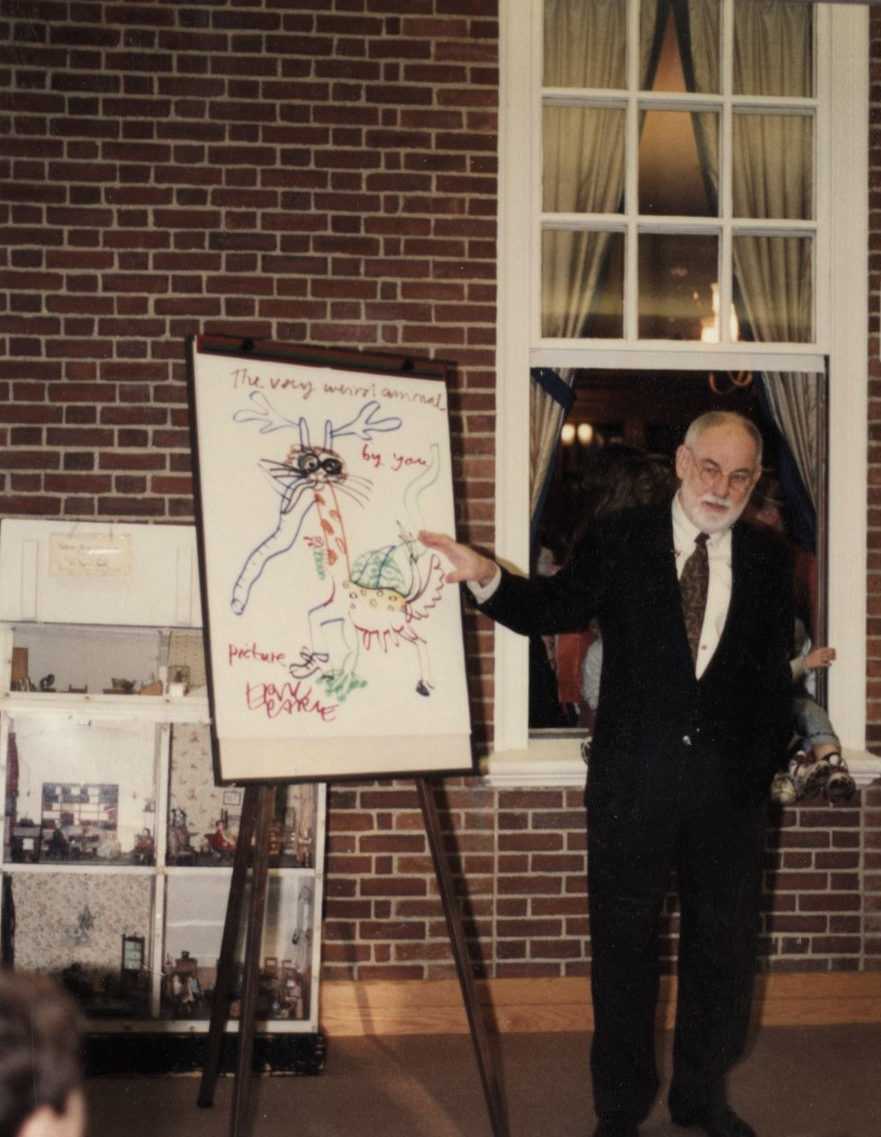 Image description: A color photograph of author Eric Carle, an older white man with white hair and a beard. He wears glasses, a shirt and tie, and a black jacket. He stands pointing at an easel with a drawing of a colorful, imaginary animal.