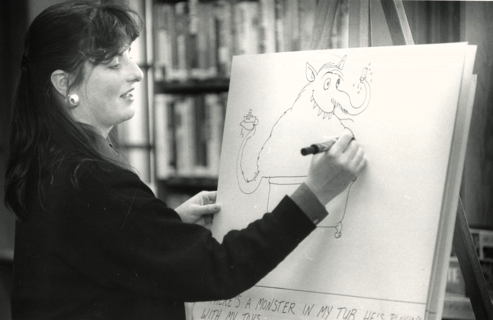 Image description: A black-and-white photograph of illustrator Karen Milone, a white woman with long dark hair. She stands at an easel and drawn a picture of a monster in a bathtub. Beneath the illustration is text reading "There's a monster in my tub. He's playing with my toys."