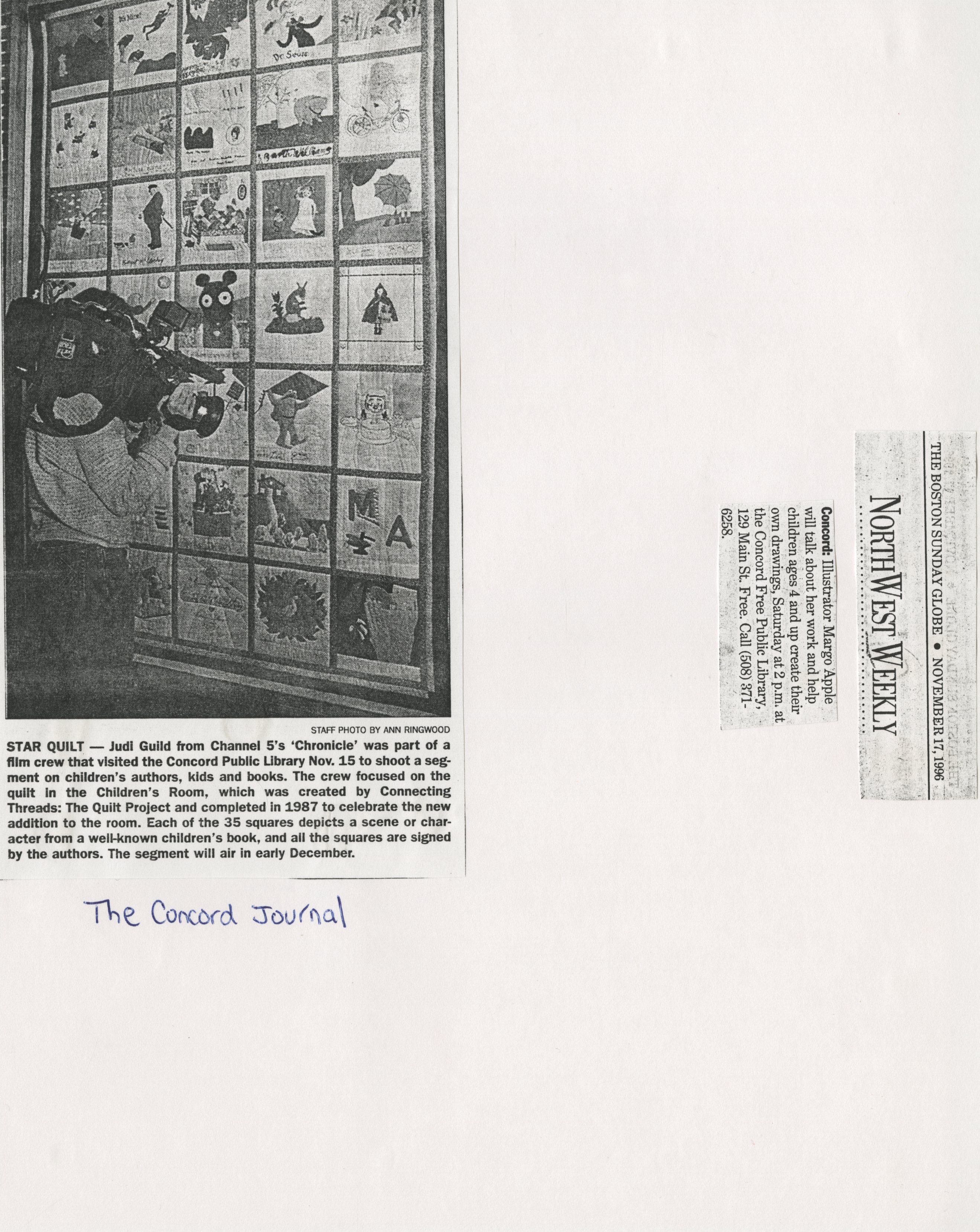 Image description: A collage of several news clippings on white paper. The first clipping, from the Concord Journal, shows the large quilt hung in the children's room (now hung in the Sudbury Road entrance). The quilt has 35 squares, each depicting a well-known children's book. A camera operator stands in front of the quilt. Text below the image reads: