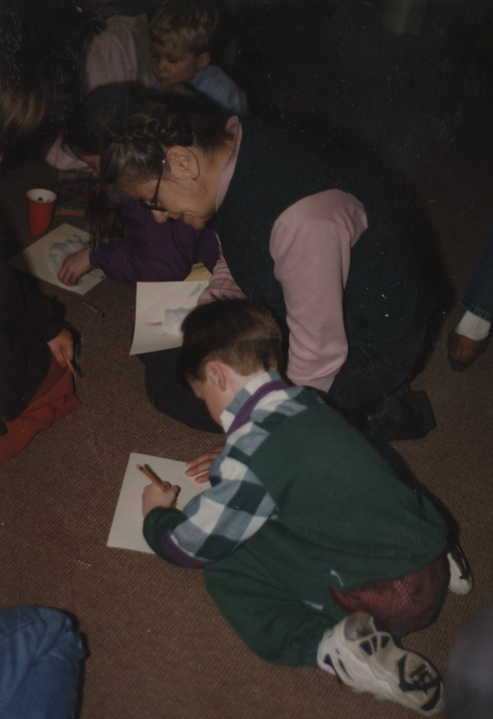 Image description: A color photograph of illustrator Margot Apple, a white woman with grey hair. She wears glasses, a pink shirt, and a black vest. She kneels on the floor next to a young boy who is drawing with a pencil.