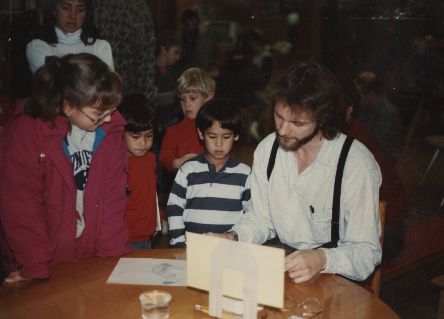 Image description: A color photograph of author Michael Emberley, a white man with brown hair and a beard. He wears a white shirt with black suspenders. A group of children stand around him while he signs a book.