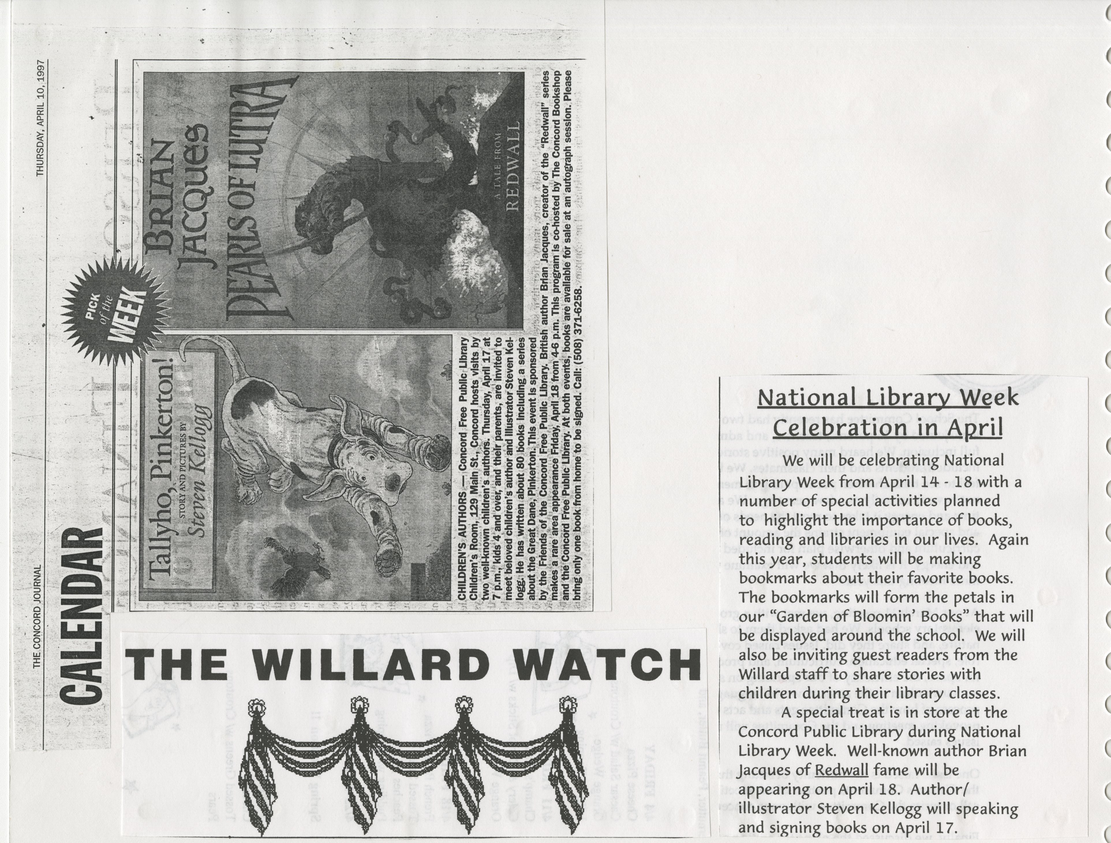 A special treat is in store at the Concord Public Library during National Library Week. Well-known author Brian Jacques of Redwall fame will be appearing on April 18. Author/illustrator Steven Kellogg will speaking and signing books on April 17.