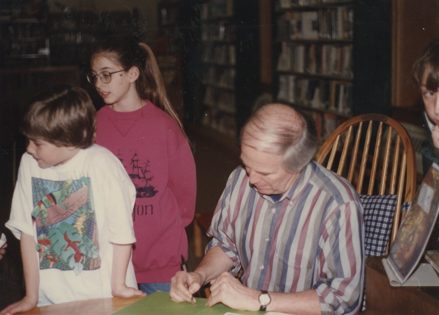 Image description: A color photograph of author Steven Kellogg, a white man with grey hair wearing a striped shirt. He sits at a table and signs a book. Several children stand around him.