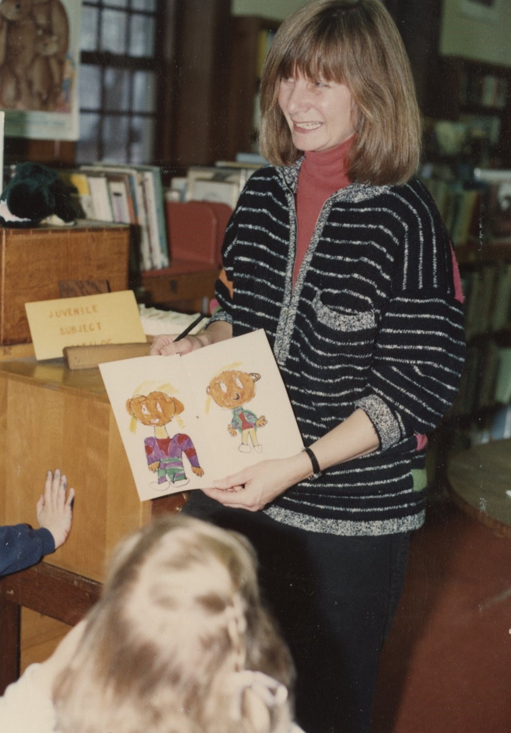 Image description: A color photograph of illustrator Susanna Natti, a white woman with shoulder-length brown hair. She wears a red turtleneck and a striped jacket. She stands in front of an audience of children and holds up a child's drawing.