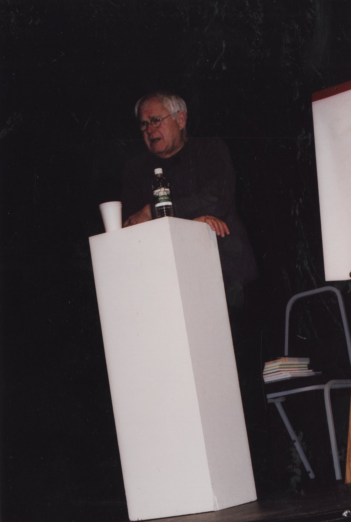 Image description: A color photograph of author Tomie dePaola, an older white man with white hair and glasses. He leans on a white podium and talks to the audience. On the podium are a bottle of water and a white cup.