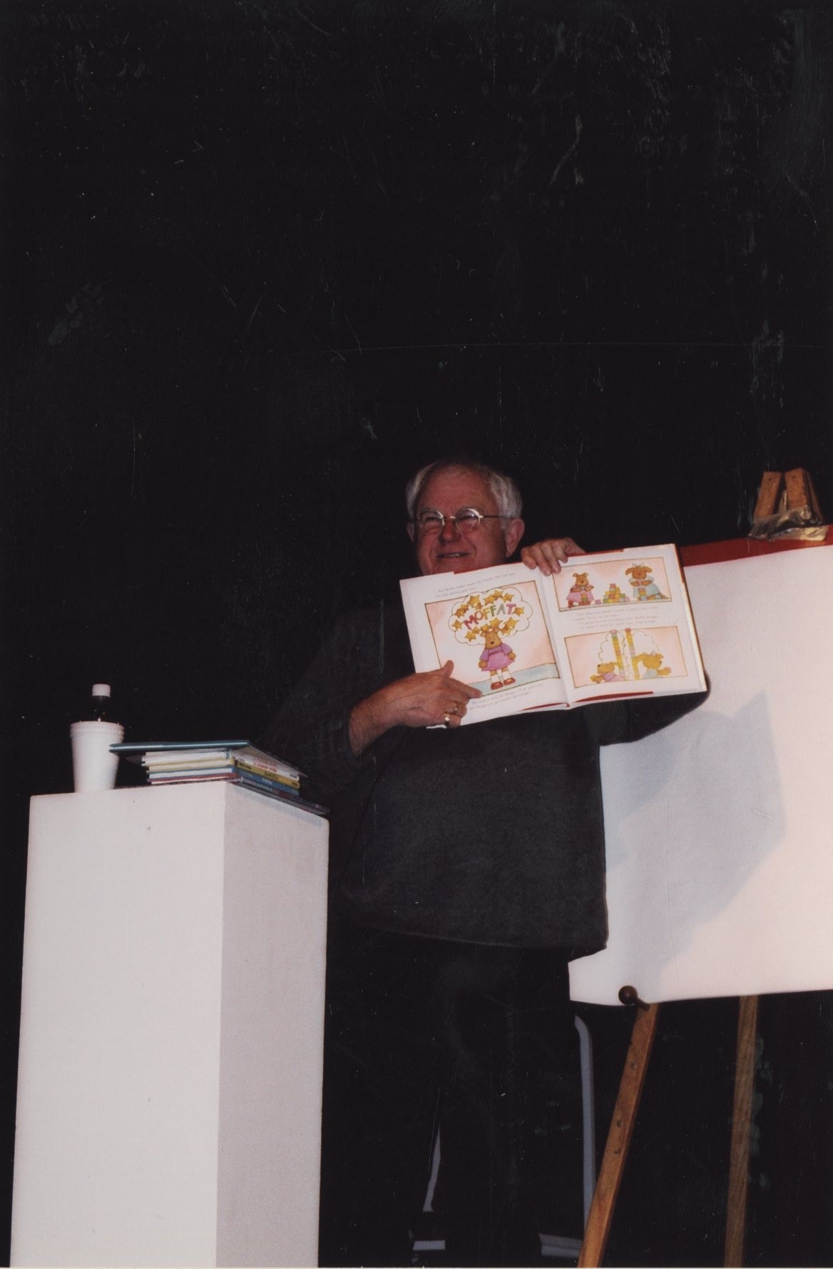 Image description: A color photograph of author Tomie dePaola, an older white man with white hair and glasses. He stands in front of an audience with an easel behind him. In front of him is a white podium with a stack of books on top. dePaola smiles at the audience and holds open a page of his book Meet the Barkers.