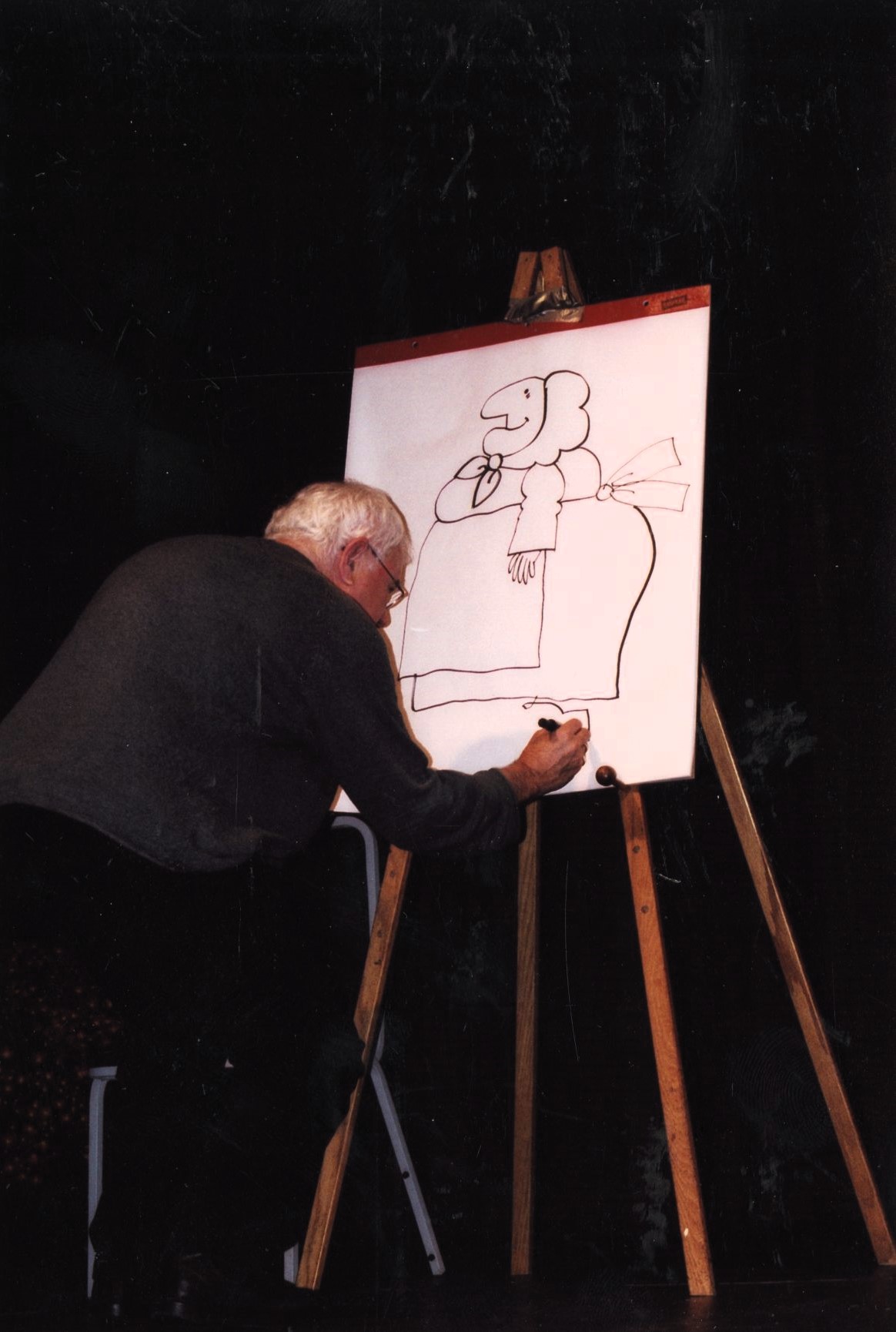 Image description: A color photograph of author Tomie dePaola, an older white man with white hair and glasses. He crouches in front of an easel with his back to the audience and draws his character Strega Nona.