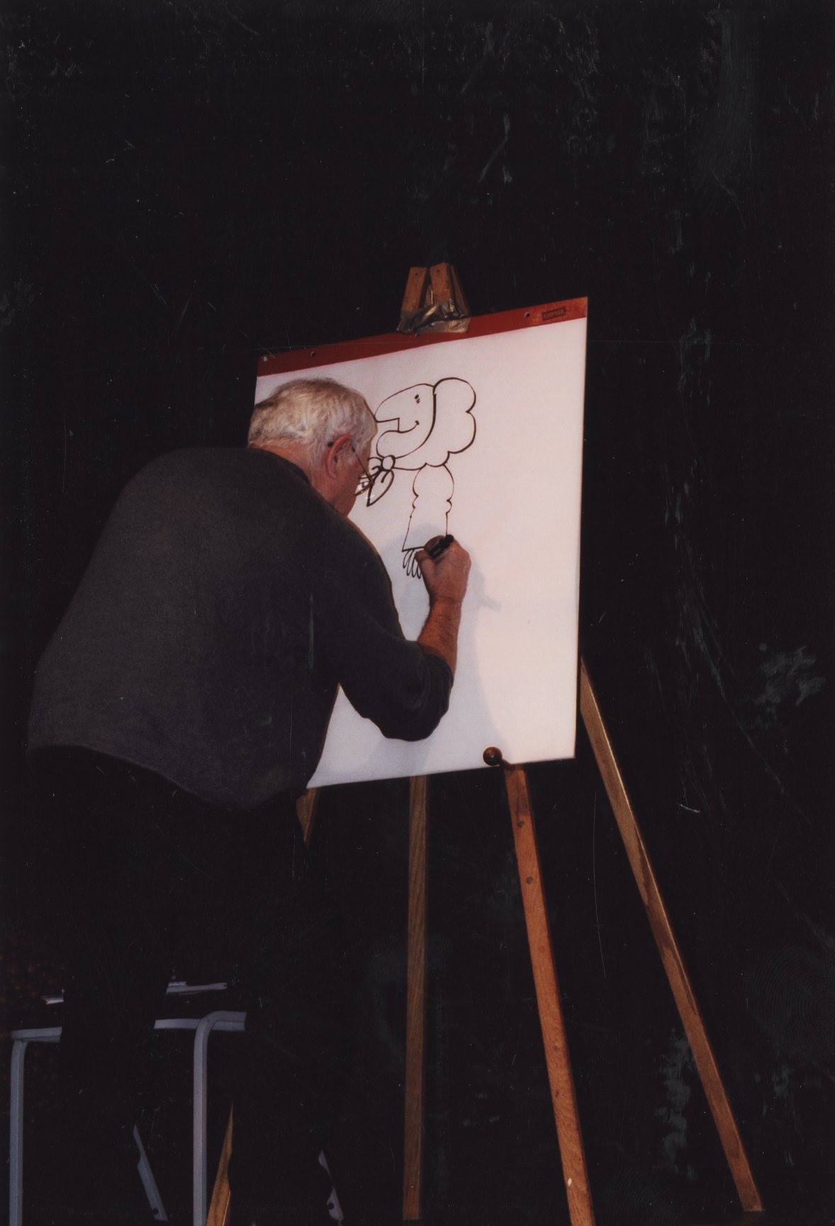 Image description: A color photograph of author Tomie dePaola, an older white man with white hair and glasses. He stands with his back to the audience and draws his character Strega Nona on an easel.