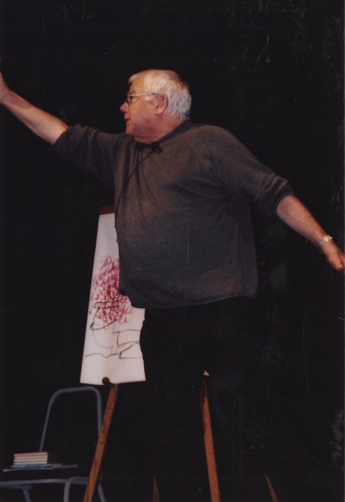 Image description: A color photograph of author Tomie dePaola, a older white man with white hair and glasses. He wears a grey shirt and stands in front of an easel covered in red spirals. He gestures dramatically with one arm.
