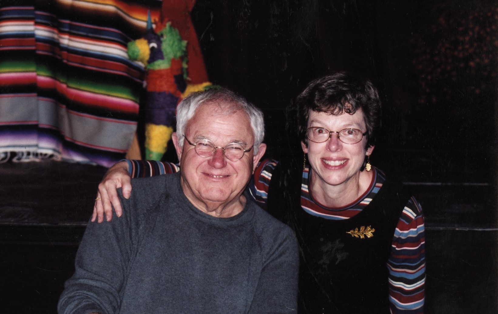Image description: A color photograph of author Tomie dePaola, an older white man with white hair and glasses wearing a grey shirt. An older woman with short hair, glasses, and wearing a black jumper over a striped shirt poses with her arm around dePaola.