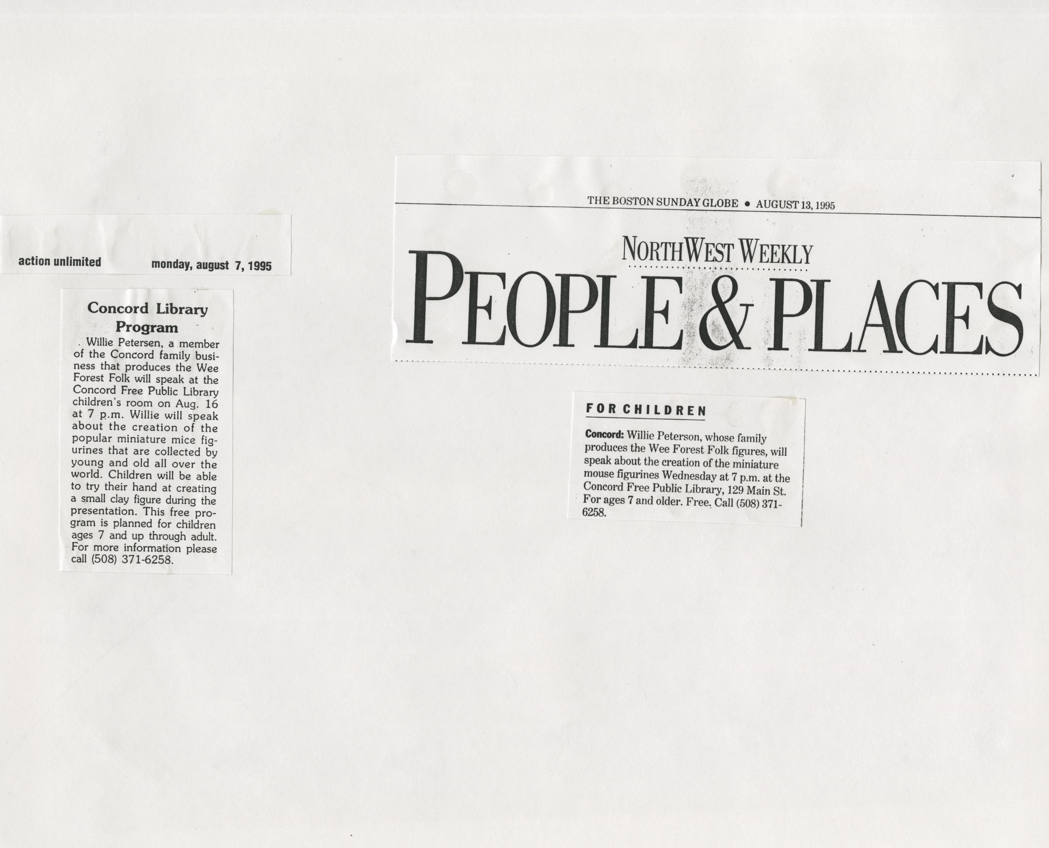Concord: Willie Peterson, whose family produces the Wee Forest Folk figures, will speak about the creation of the miniature mouse figurines Wednesday at 7 p.m. at the Concord Free Public Library, 129 Main St. For ages 7 and older. Free. Call (508) 371-6258.